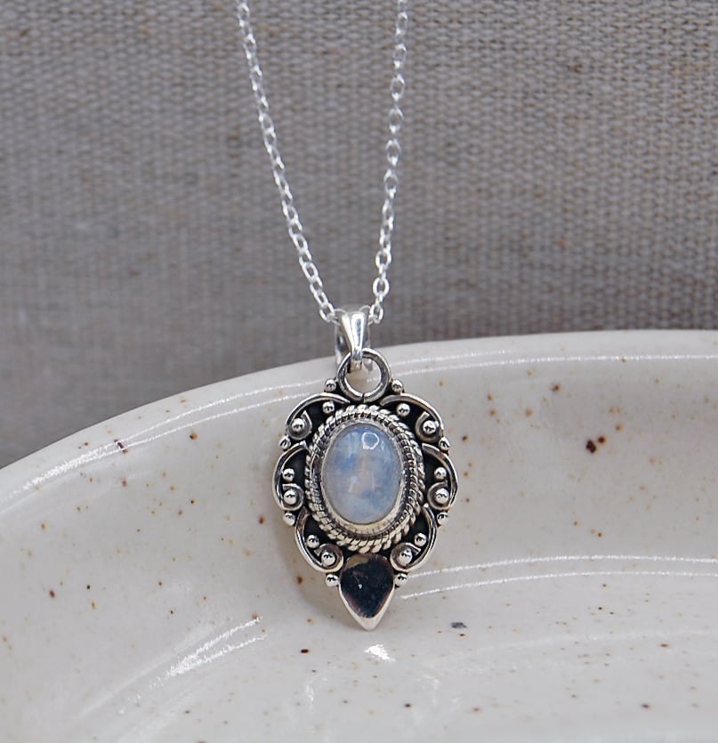 Our Maeve pendant features an intricate design with a cabochon gemstone.