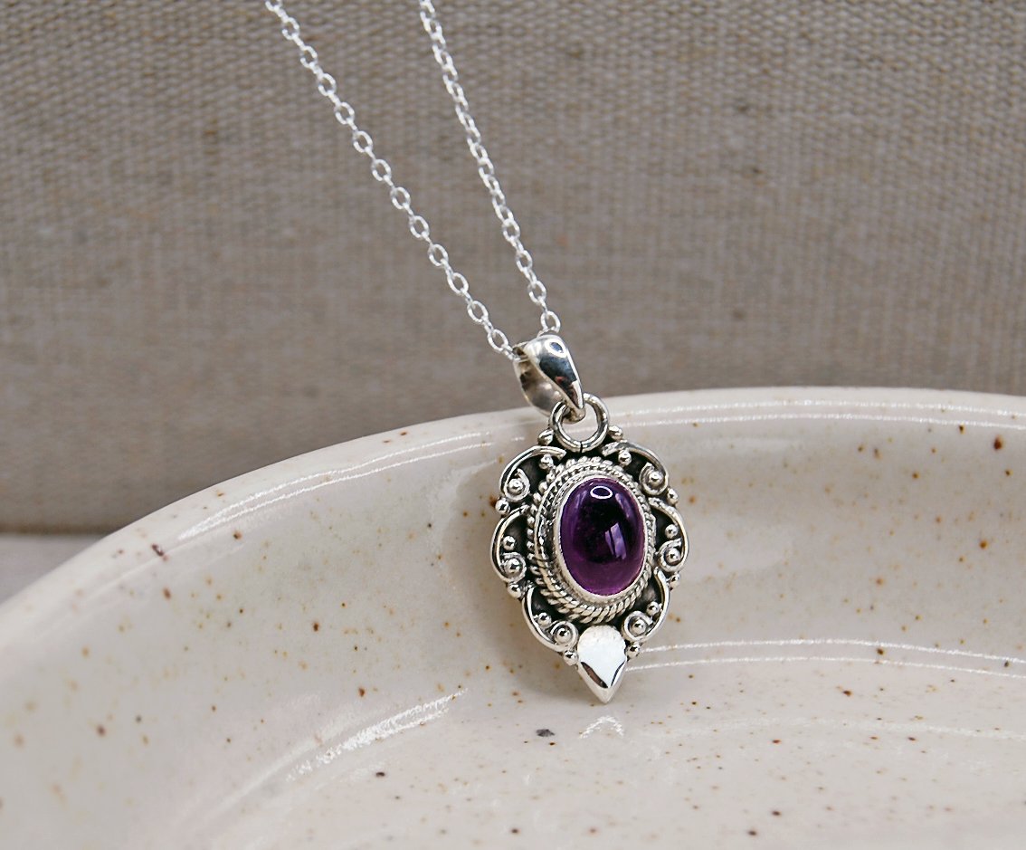 Our Maeve pendant features an intricate design with a cabochon gemstone.